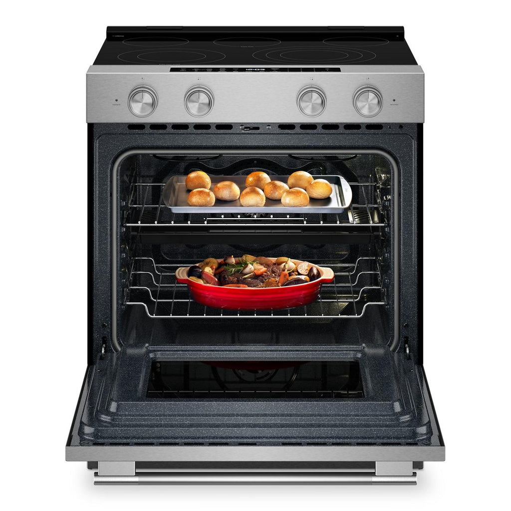 Keep your oven clean with two distinct cycles. The Steam Clean Cycle, perfect for quick, routine maintenance, helps loosen cooked-on food in under an hour. Simply add water to the bottom of the oven and wipe down after the cycle. For a deeper clean, the high-temperature Self-Clean Cycle powers through baked-on spills, leaving the oven cavity clean with just a final wipe-down.
