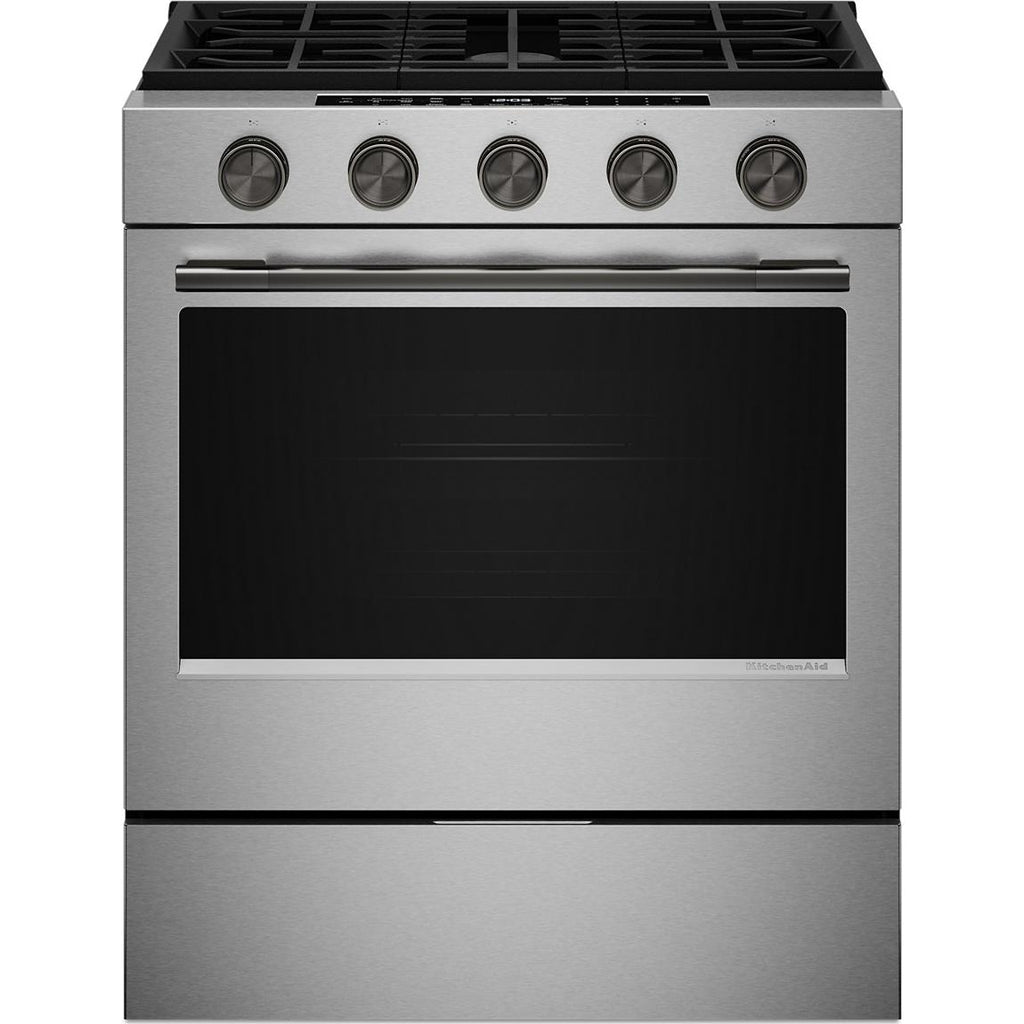 KitchenAid 5.0 Cu. Ft. Smart Slide-in Gas Range with Convection Cooking Modes and 2-in-1 Burner. Enjoy a range of possibilities... KitchenAid 5.0 Cu. Ft. Smart Slide-in Gas Range with Convection Cooking Modes and 2-in-1 Burner. Enjoy a range of possibilities with our most powerful KitchenAid 30-inch Gas Range available, featuring the industry’s most powerful and largest 2-in-1 burner for an unparalleled and versatile cooking experience. Convection Cooking Modes help you get consistent results with optimal temperatures. A Steam Bake mode works with the included steam rack to provide additional moisture during baking, so you can enjoy Basque cheesecake and other delicious desserts. The range is designed to be personalized with a curated palette of exterior finishes and mixed metal hardware. It’s also a Wi-Fi-enabled Smart Appliance model with smart features and mobile app experience. View more
