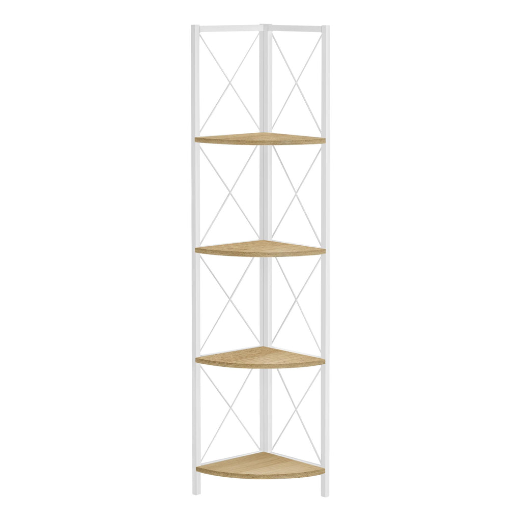 • 4 tier metal etagere bookcase with evenly-spaced, fan-shaped shelves in natural wood-look finish