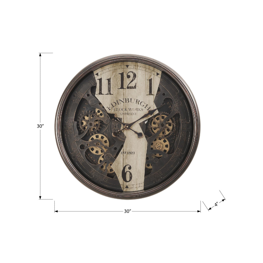 • In a timeless, deconstructed industrial design, this large oversized 30" round wall clock with a moving gear mechanism, makes a distinct statement in transitional home decors