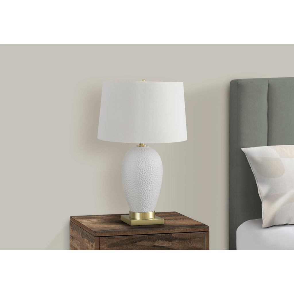 • Elevate your home with this transitional style, 26"h white ceramic table lamp with a textured finish and a stylish gold metal finial and base attached to a clear 6ft long cord