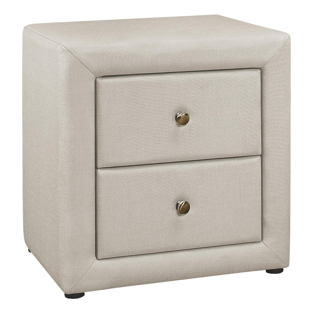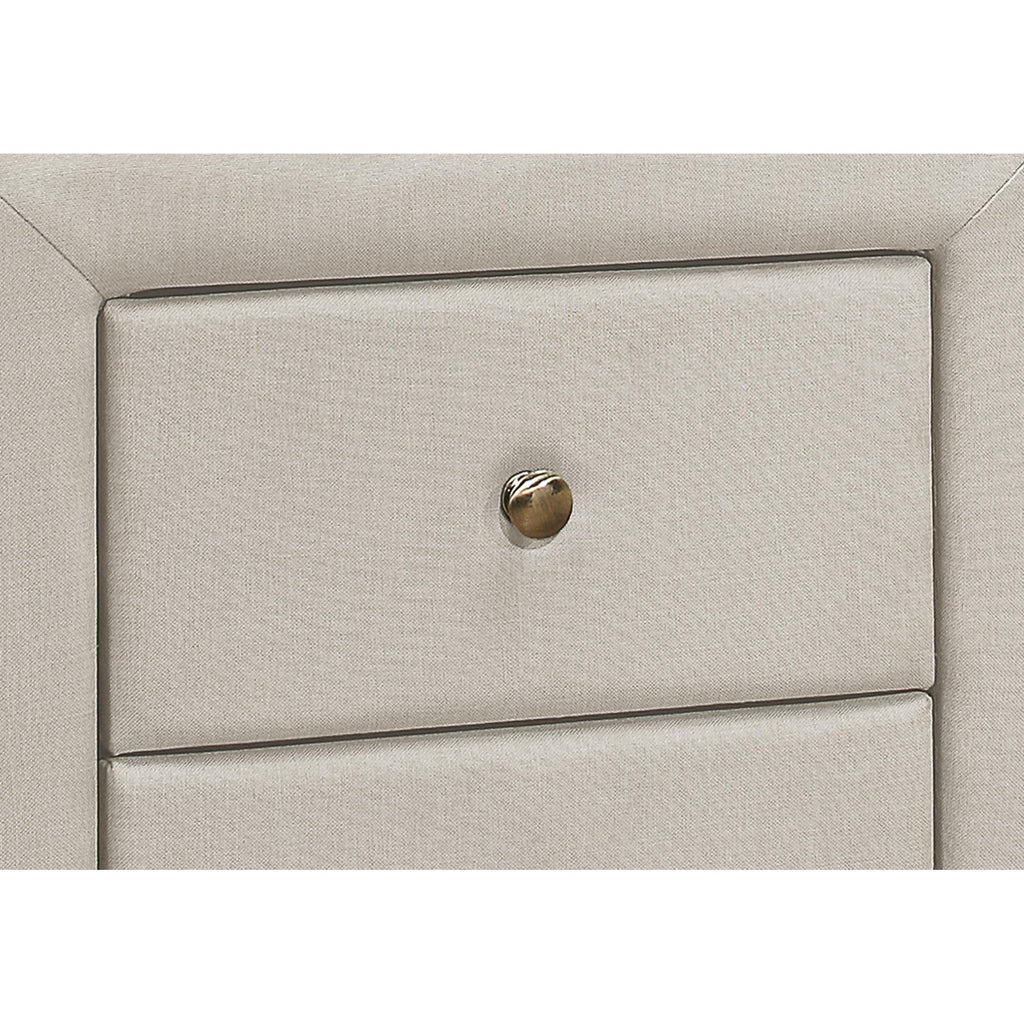 • Upholstered in beige linen-look fabric with a chrome-finished metal drawer knob