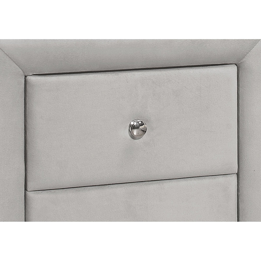 • Upholstered in a rich light grey velvet-look fabric with a chrome-finished metal drawer knob