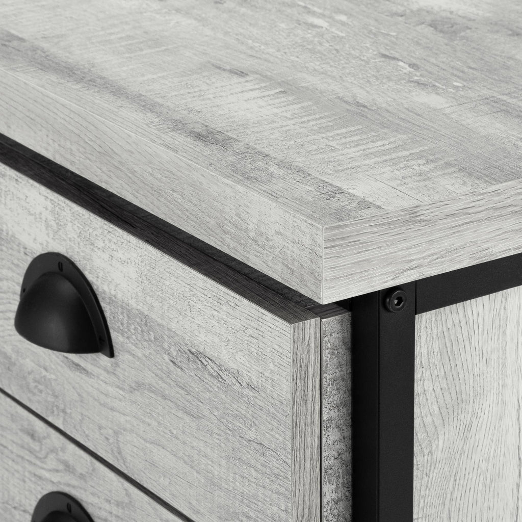 • 3 storage drawers on metal glides with retro-inspired black metal cup pulls