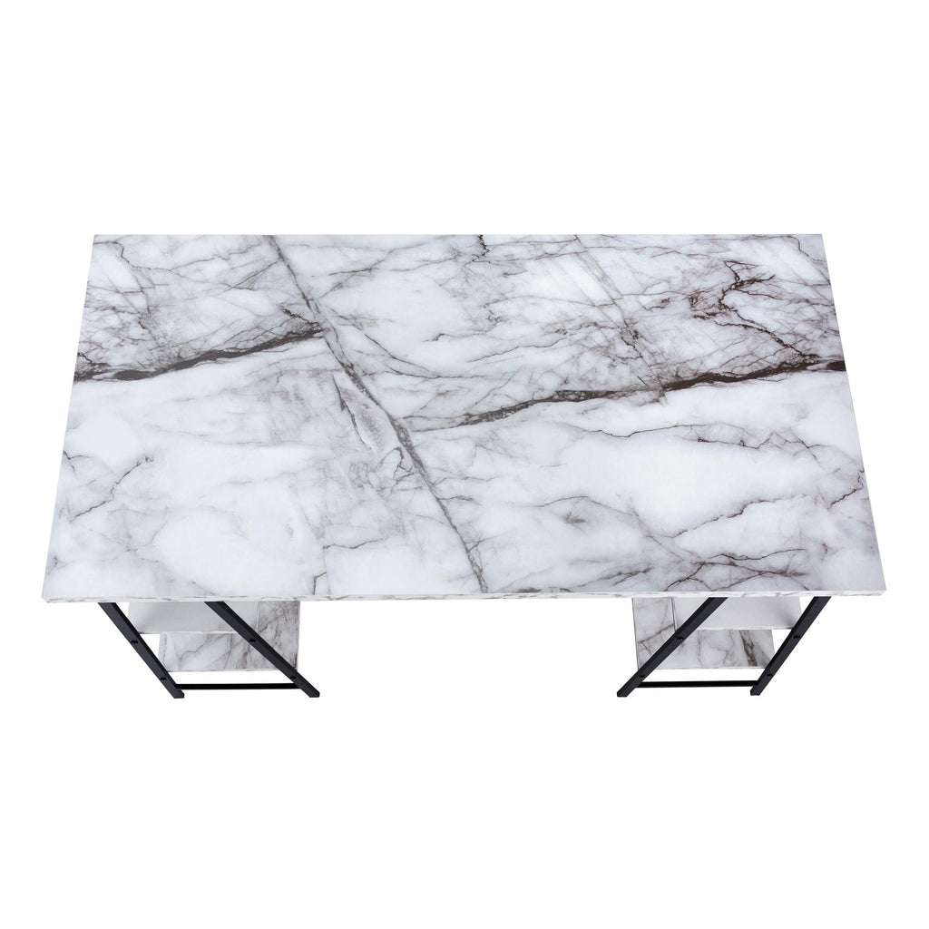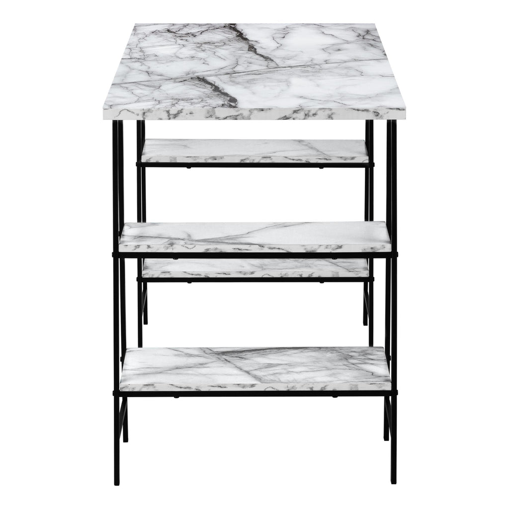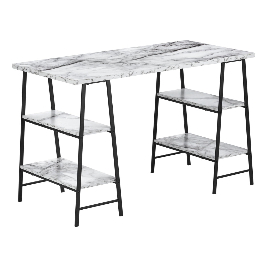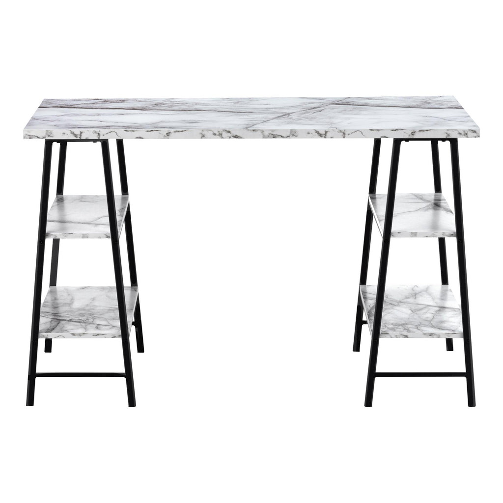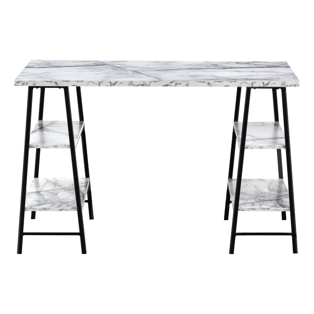 • Industrial-style computer desk with 4 fixed, open shelves supported by sawhorse-style legs