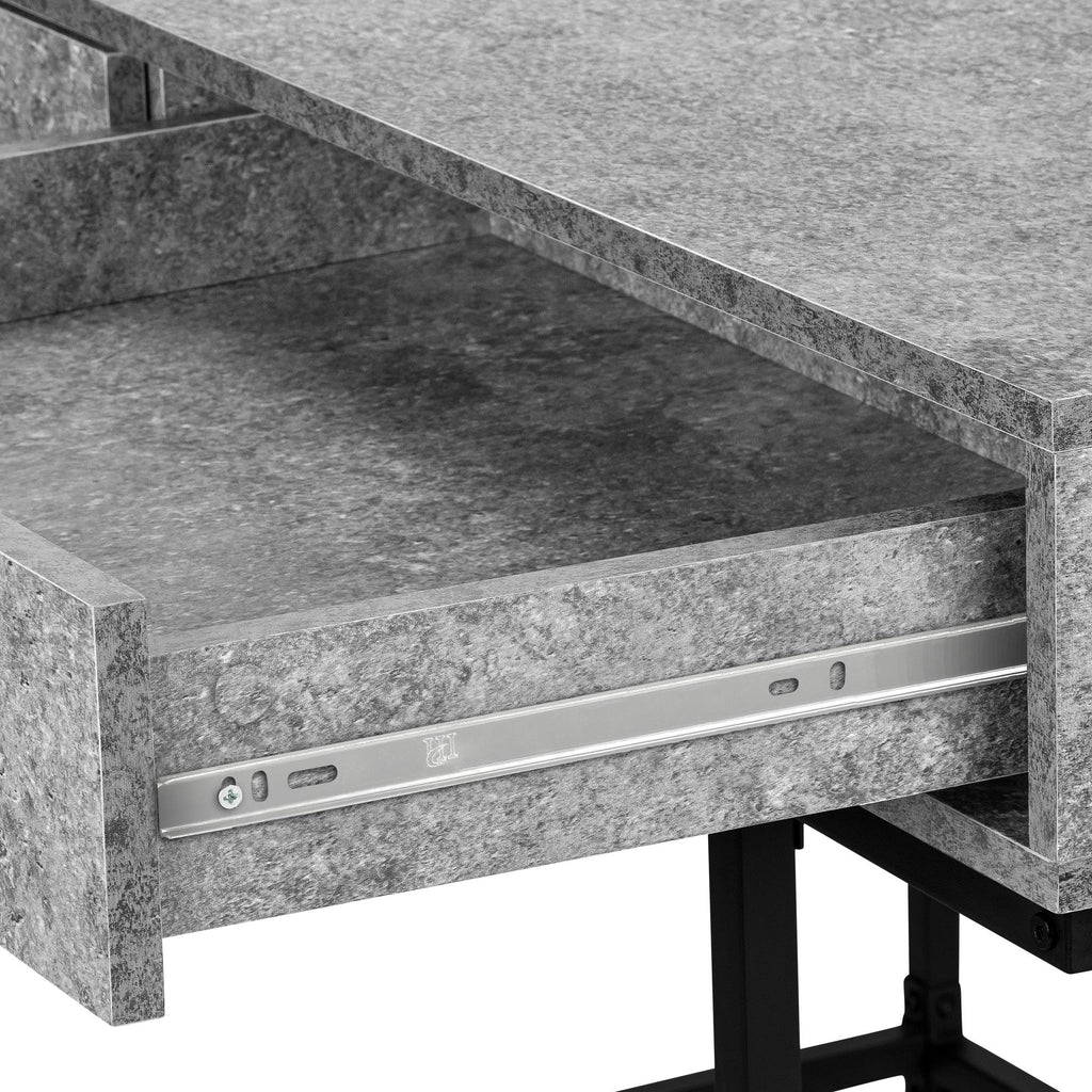 • Computer desk in a gray finish with 2 storage drawers featuring wide, cutout handles and metal drawer slides