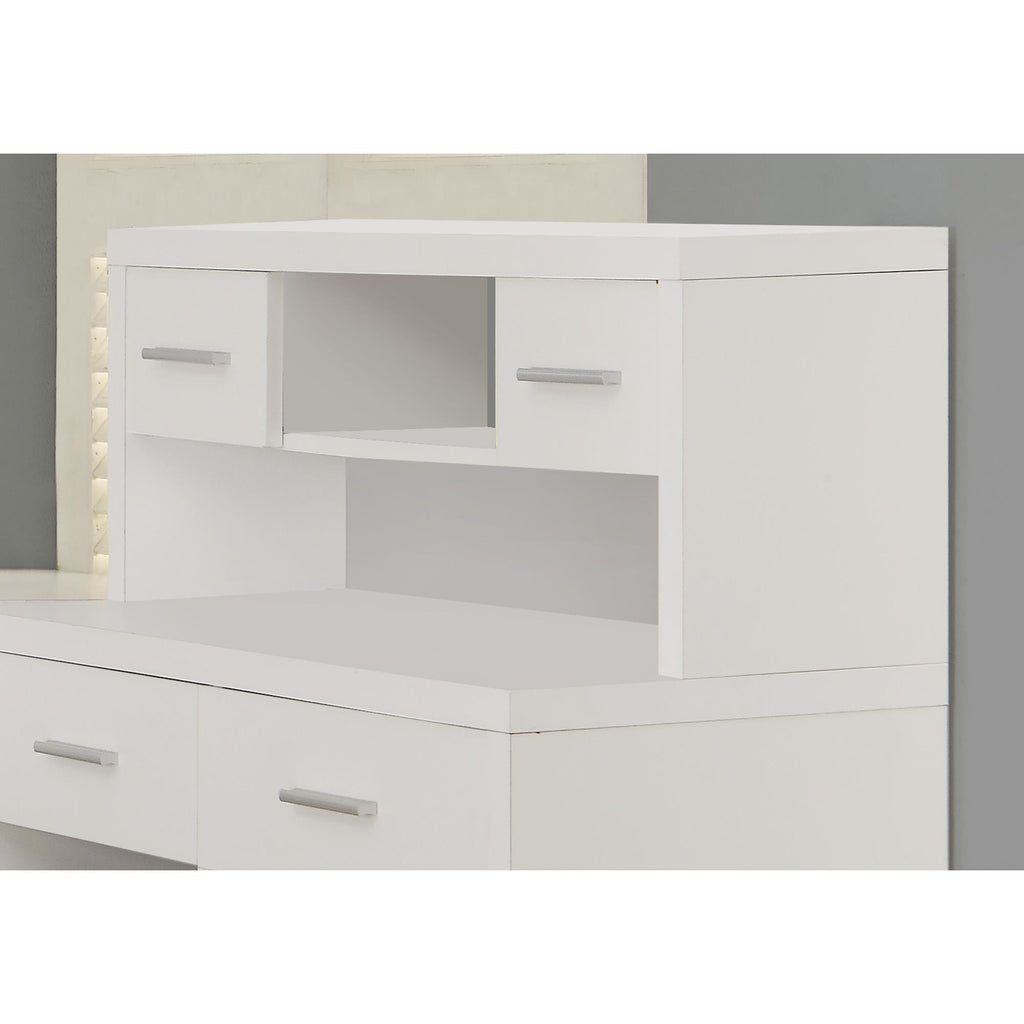 White finish; Eight drawers; Dimensions for Computer desk: 47"W x 31"H x 24"D; Desk and Hutch: 36"W x 43"H x 16"D; Corner piece: 24"w x 15"D; Open shelves