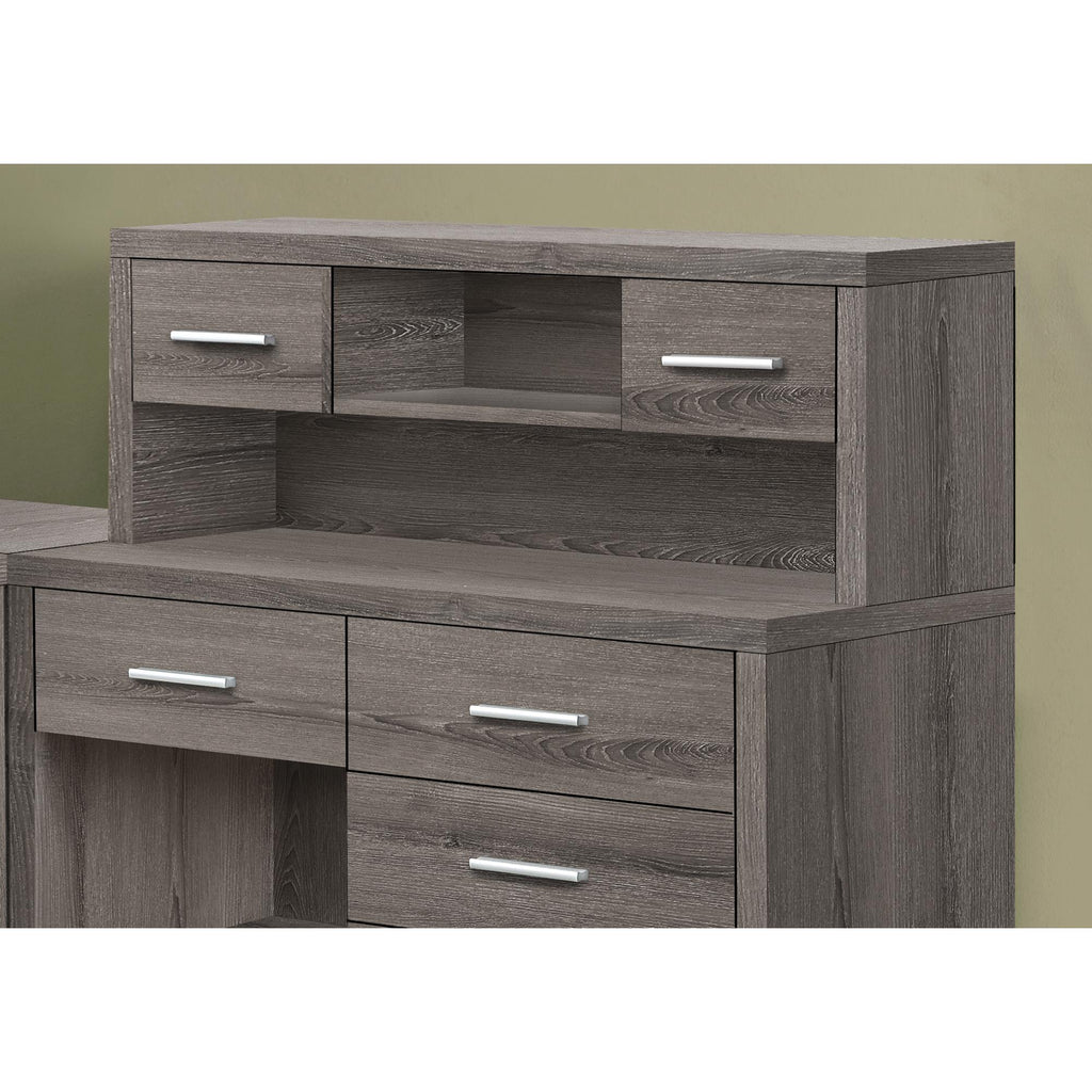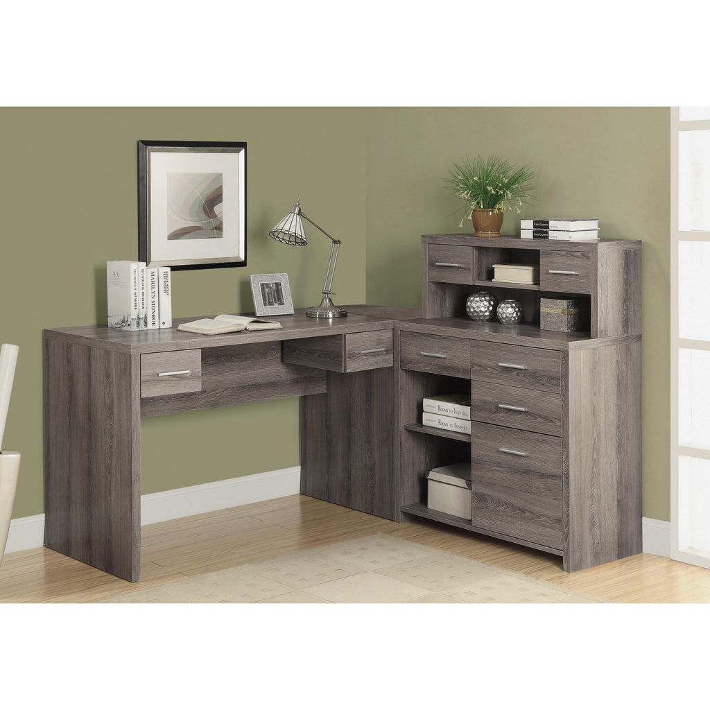 • L-shaped computer desk with storage and a hutch featuring thick-panel construction in a dark taupe wood-look finish