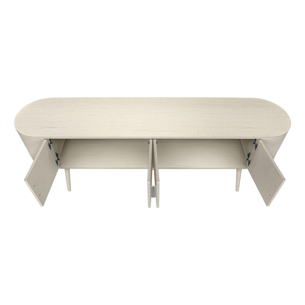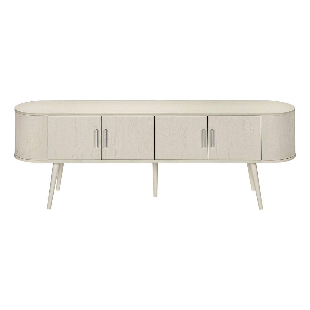 • A trendy 72 inch tv stand featuring a sleek, antique white laminate finish with an easy to clean top, perfect for adding a touch of retro style to your living room or bedroom