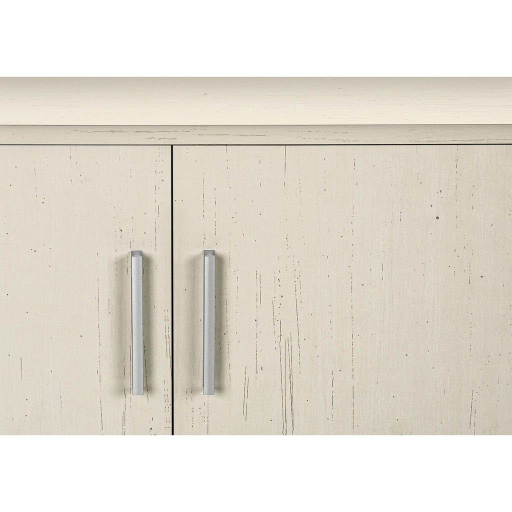 • Durably designed with antique white solid wood legs, this console offers spacious storage cabinets and 2 hidden cable management holes for organizing your media entertainment center