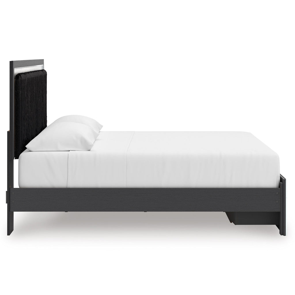 • Includes upholstered panel headboard, storage footboard, platform rails and roll slats