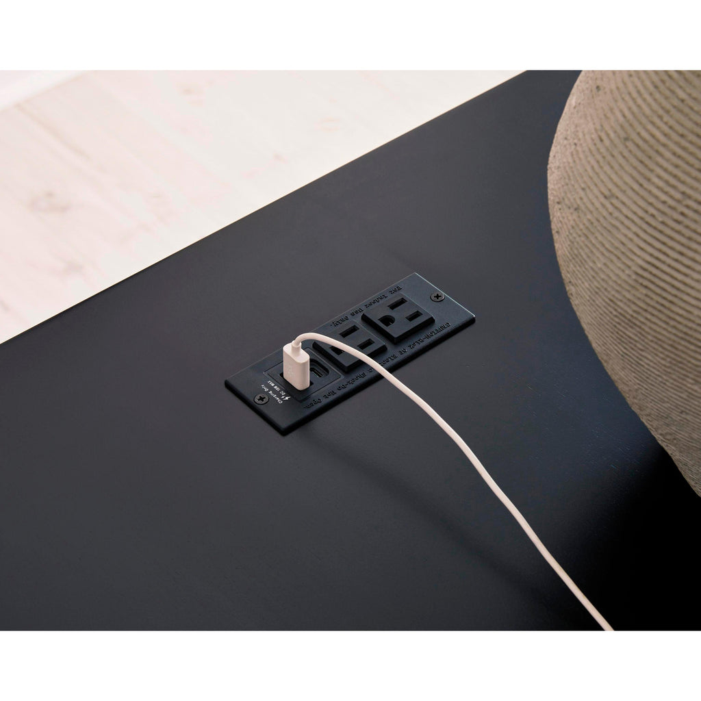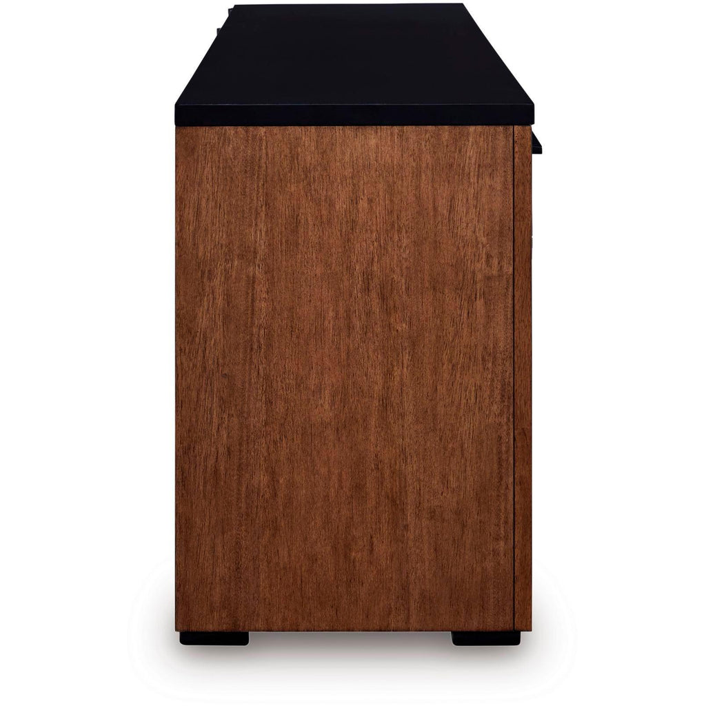 Double down on casual chic with the two-tone look of this credenza. With its warm brown and matte black finishes,... Double down on casual chic with the two-tone look of this credenza. With its warm brown and matte black finishes, it reflects your eye for modern design. The trend-right slatted styling on its doors brings added charm. And with the credenza's adjustable shelves, open storage and accessories drawer, keeping office essentials organized is a breeze. View more